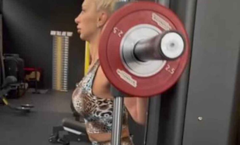 Облечена во тесни шарени хеланки и спортска куса маичка со истиот леопард дезен таа се поти во теретаната додека ги прави напорните вежби.