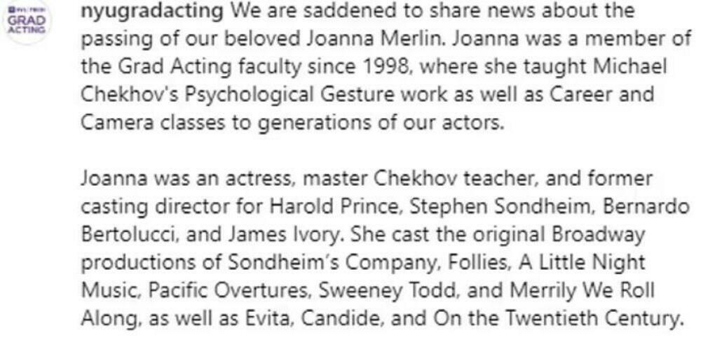 – Со тага ја споделуваме веста за смртта на нашата сакана Џоана Мерлин. Од 1998 година, Јоана е член на Факултетот за глума на Градскиот факултет, каде што предаваше „Психолошки гест“ на Мајкл Чехов пред генерации наши актери, како и часови за кариера и камера.