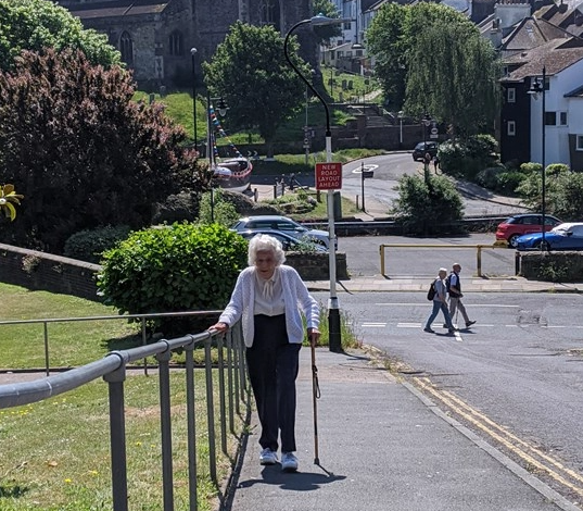 Жена на возраст од 103 години се движи горе долу по ридот во близина на домот за старци каде живее за да поттикне донации за Бритиш Харт Фондацијата.
