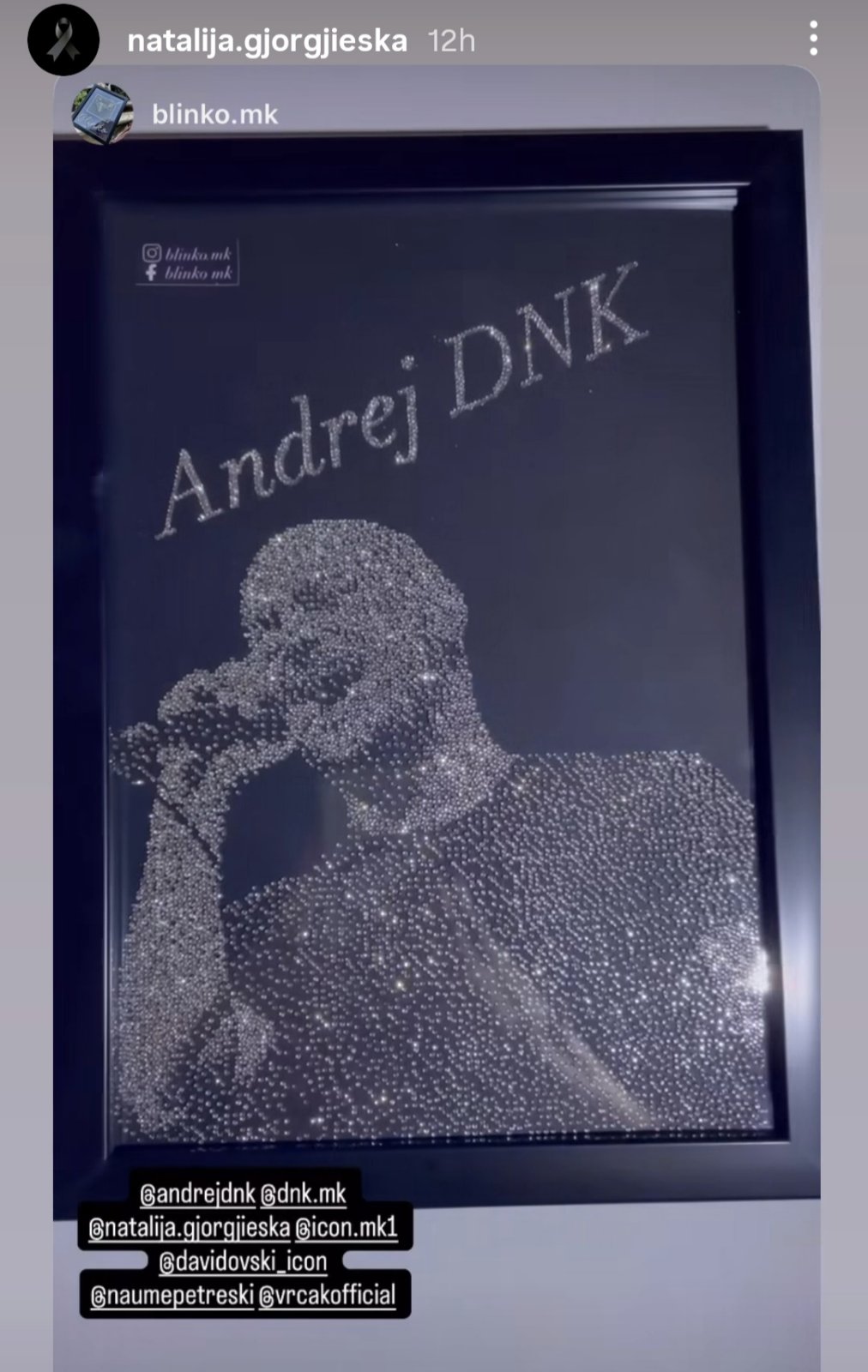 „Во чест на нашиот непреболен Андреј од ‘ДНК’. Твојата енергија, твојот глас и твојата насмевка останаа како ехо што никогаш не замолкнува. Препознатлив, неповторлив, глас што носеше радост, љубов и младешка сила. Секој блесок на цирконите ја раскажува твојата приказна. Ти благодарам, Андреј, што остави трага што свети и понатаму. Оваа слика ја посветуваме на семејството на Андреј и на сите негови обожаватели.“
