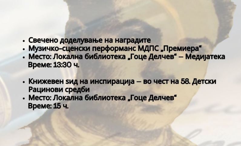 ДЕТСКИ РАЦИНОВИ СРЕДБИ – започнуваат со историски час во првото училиште на Рацин и „Бдеење пред мугрите“