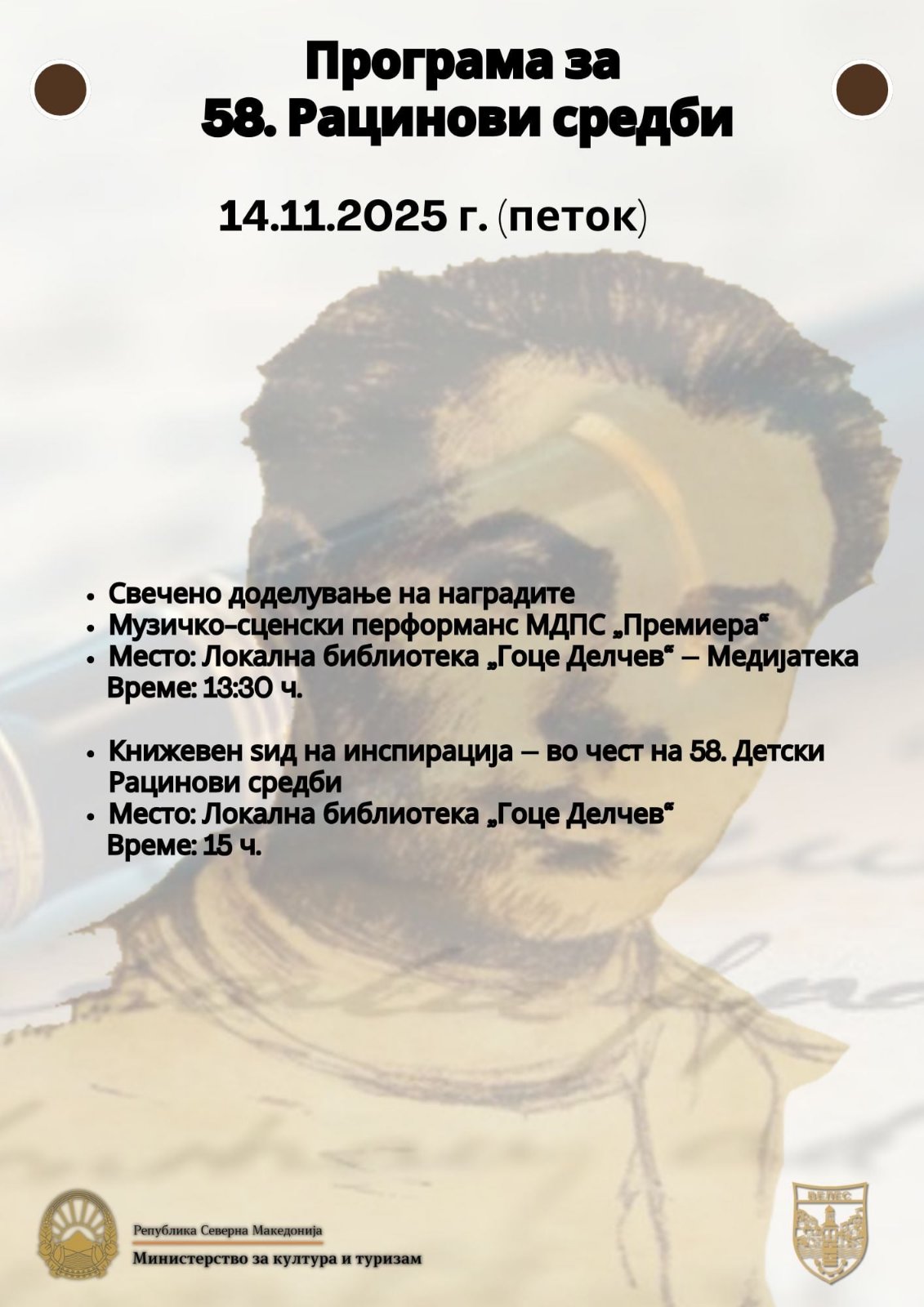 Од 12 до 14 ноември Велес го отвора срцето ширини – широко за Рациновите наследници. 58 пат во Велес се одржуваат Детските Рацинови средби во чест на Бесмртниот, Црвен поет, Коста Апостолов Солев Рацин, најмасовната, најубавата, најкреативната, културна манифестација за учениците од основните и средните училишта.