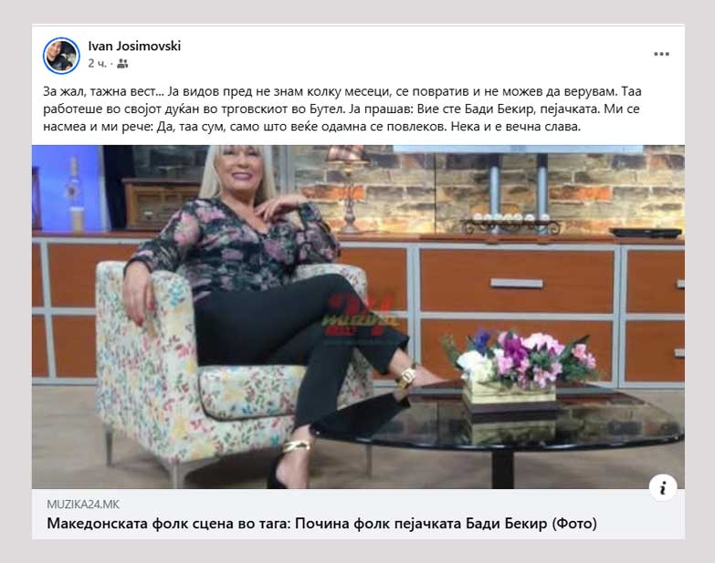 „За жал, тажна вест… Ја видов пред не знам колку месеци, се вратив и не можев да верувам. Таа работеше во својот дуќан во трговскиот во Бутел. Ја прашав: Вие сте Бади Бекир, пејачката. Ми се насмеа и ми рече: Да, таа сум, само што веќе одамна се повлеков. Нека и е вечна слава“, напиша за Бади на Фејсбук новинарот Иван Јосимовски од „Музика 24“.