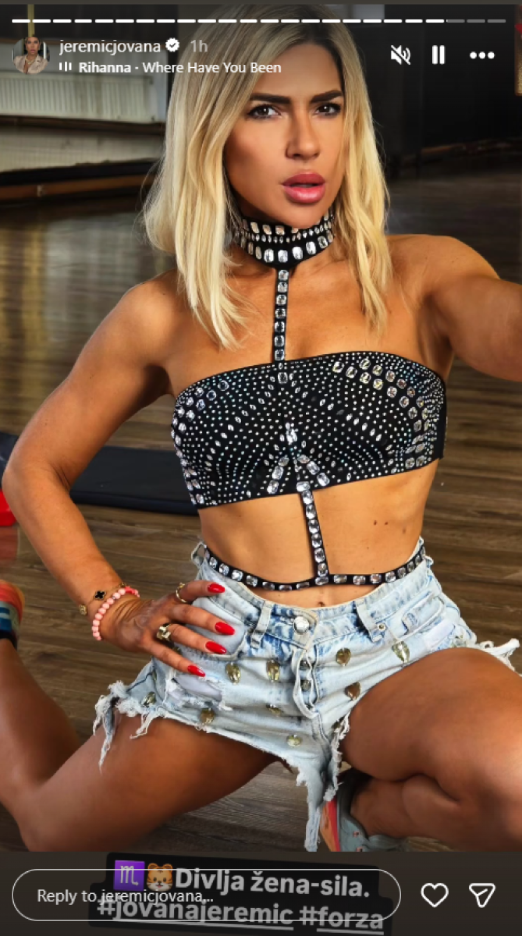Водителката Јована Јеремиќ повторно го привлече вниманието на јавноста со провокативни фотографии што ги објави на своите профили на социјалните мрежи. Таа позираше во танцова сала, облечена во ултра краток тексас шортс, светкав топ со циркони и чокер, објавувајќи впечатливи кадри што веднаш предизвикаа лавина реакции.