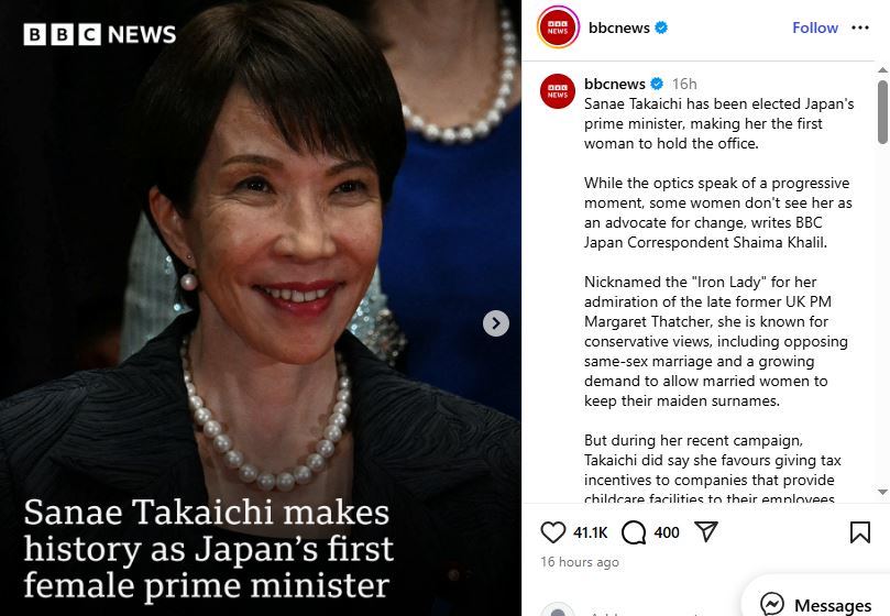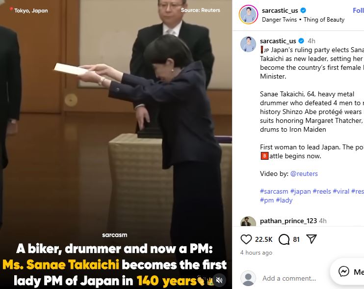 Во меѓувреме, таа свиреше тапани во хеви-метал бенд, возеше голем мотор по улиците на Нара и читаше прирачници за политичка стратегија. На крај, им ги затвори устите на сите: во вторник, на 21 октомври, Санае Такаичи стана првата жена премиер во историјата на Јапонија и тоа во еден од најкритичните моменти за земјата.