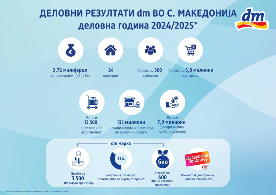 Со вкупен промет од 3,72 милијарди денари што претставува раст од 21,21 отсто, компанијата dm drogerie markt забележа уште една успешна година со што дополнително ја зацврсти позицијата меѓу водечките малопродажни синџири на македонскиот пазар. Вкупните инвестиции во изминатата година изнесуваа 133 милиони денари, што сведочи за континуиран развој на продажната мрежа, воведување нови технолошки решенија и континуирано одржливо работење. dm drogerie markt во нашата земја е присутен во 10 градови, со 24 продажни објекти.