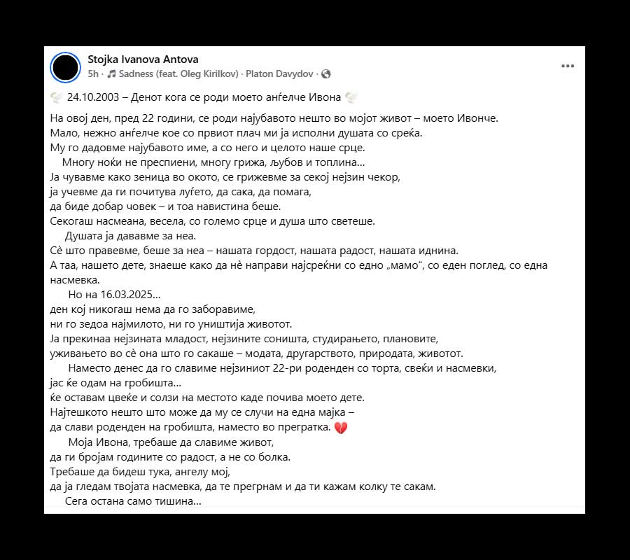 „Моја Ивона, требаше да славиме живот, да ги бројам годините со радост, а не со болка. Требаше да бидеш тука, ангелу мој, да ја гледам твојата насмевка, да те прегрнам и да ти кажам колку те сакам. Сега остана само тишина… и една бескрајна љубов што ја носам во срцето, љубов кон тебе, ќерко моја, што не згаснува ниту со времето, ниту со солзите“.