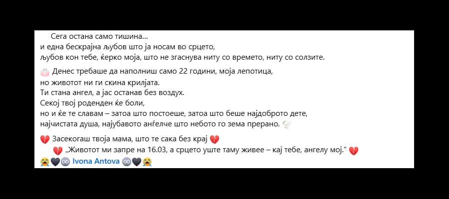 „Денес требаше да наполниш само 22 години, моја лепотица, но животот ни ги скина крилјата. Ти стана ангел, а јас останав без воздух. Секој твој роденден ќе боли, но и ќе те славам – затоа што постоеше, затоа што беше најдоброто дете, најчистата душа, најубавото анѓелче што небото го зема прерано. Засекогаш твоја мама, што те сака без крај. Животот ми запре на 16.03, а срцето уште таму живее – кај тебе, ангелу мој.“ пишуваа мајката во болка, со бројни емотикони со скршено срце меѓу тажните зборови, а сподели и фотографија од ќерката кога била бебенце.