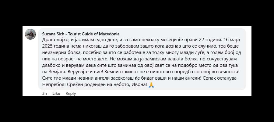 „Драга мајко, и јас имам едно дете, и за само неколку месеци ќе прави 22 години. 16 март 2025 година нема никогаш да го заборавам зашто кога дознав што се случило, тоа беше неизмерна болка, посебно зашто се работеше за толку многу млади луѓе, а голем број од нив на возраст на моето дете. Не можам да ја замислам вашата болка, но сочувствувам длабоко и верувам дека сите што заминаа од овој свет се на подобро место од ова тука на Земјата. Верувајте и вие! Земниот живот не е ништо во споредба со оној во вечноста! Сите тие млади невини ангели засекогаш ќе бидат ваши и наши ангели! Сепак останува Непребол! Среќен роденден на небото, Ивона“, напиша една корисничка на социјалните мрежи под тажната објава на Фејсбук.