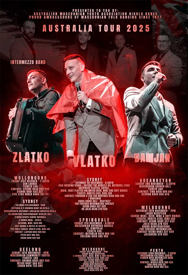 Во моментов, Влатко и Златко се на голема австралиска турнеја, каде што интересот за нивните настапи е огромен — речиси сите концерти се распродадени однапред. Македонската дијаспора таму со големи емоции ги пречекува и ужива во безвременските хитови како „Ај да ојме Јано“, „Петко љубел многу жени“, „Од там се гледа Македонија“, „За тебе Софке“, „Велат не нема“ и многу други.