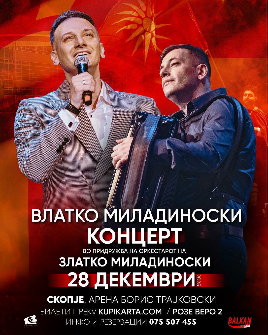 Карти за големиот концерт на Влатко Миладиноски во Арената Борис Трајковски кој ќе се одржи на 28 декември може да купите на :