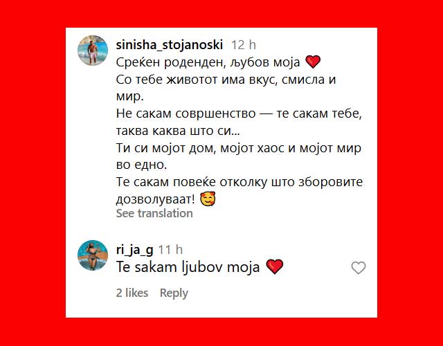 „Среќен роденден, љубов моја. Со тебе животот има вкус, смисла и мир. Не сакам совршенство — те сакам тебе, таква каква што си… Ти си мојот дом, мојот хаос и мојот мир во едно. Те сакам повеќе отколку што зборовите дозволуваат!“, напиша Синиша