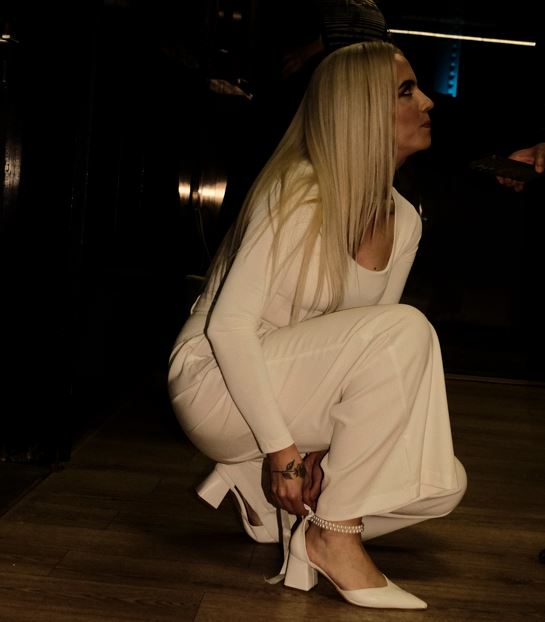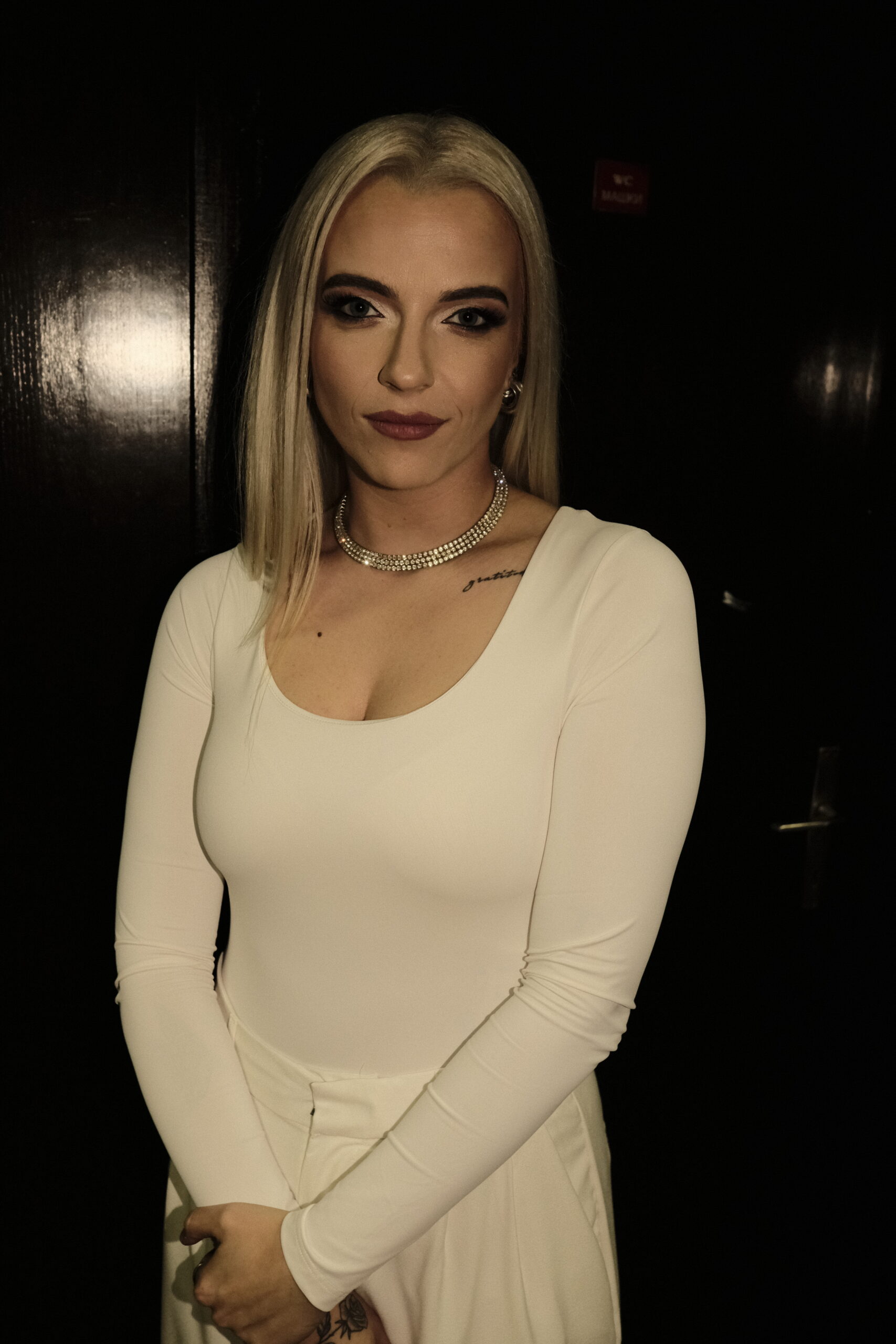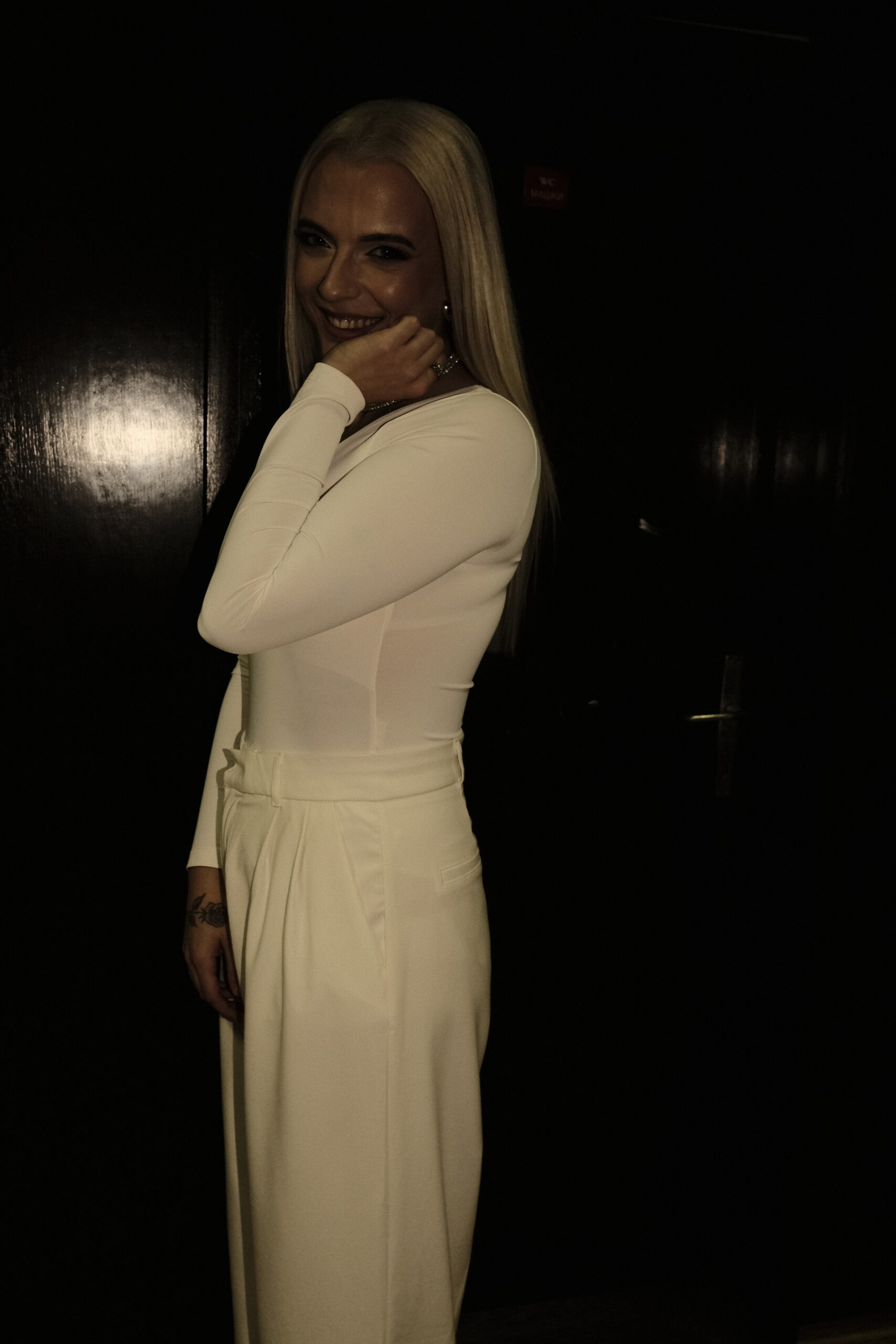 Тамара Волческа зрачеше со самодоверба во бела модна комбинација од панталони и тесна, сексапилна блуза, што беше контраст на доминантните црни изгледи.