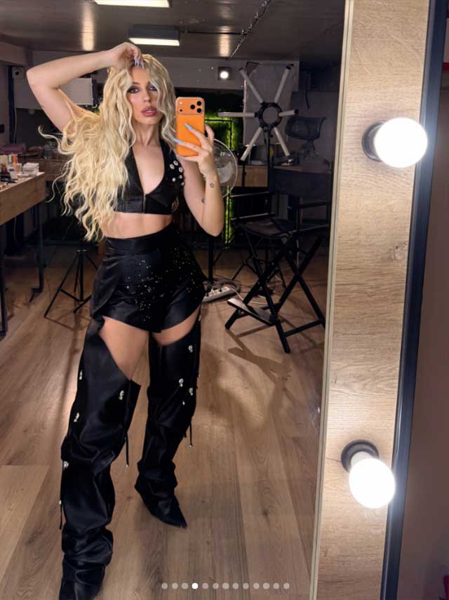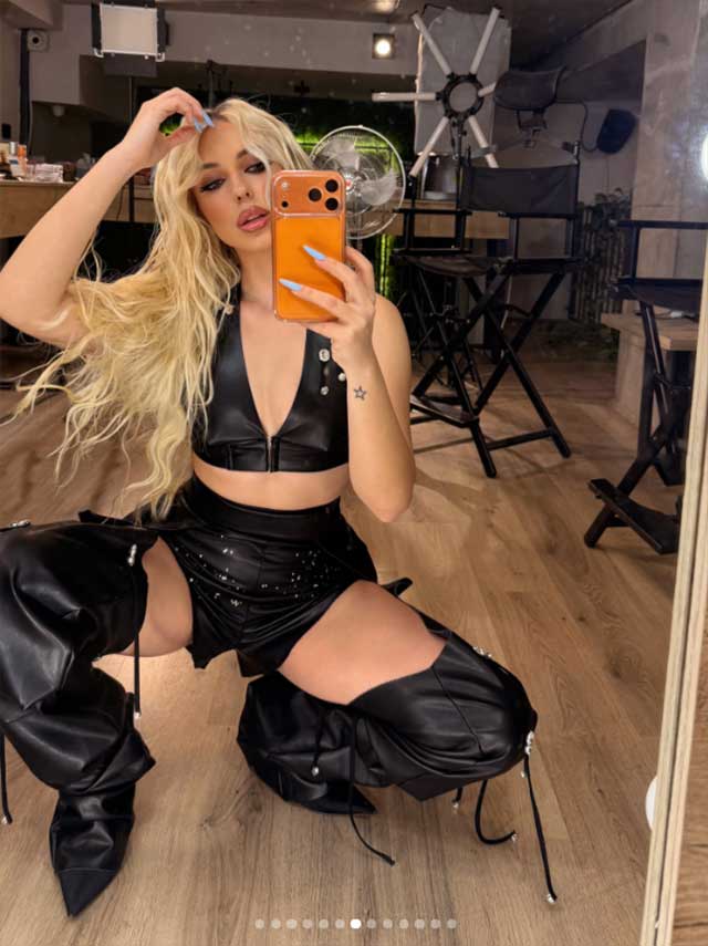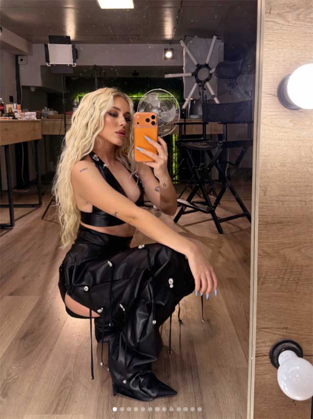 Пејачката позиураше и во провокативно изданјие, клекната и со раширени нозе, драматично изгледаше и во горниот дел.
