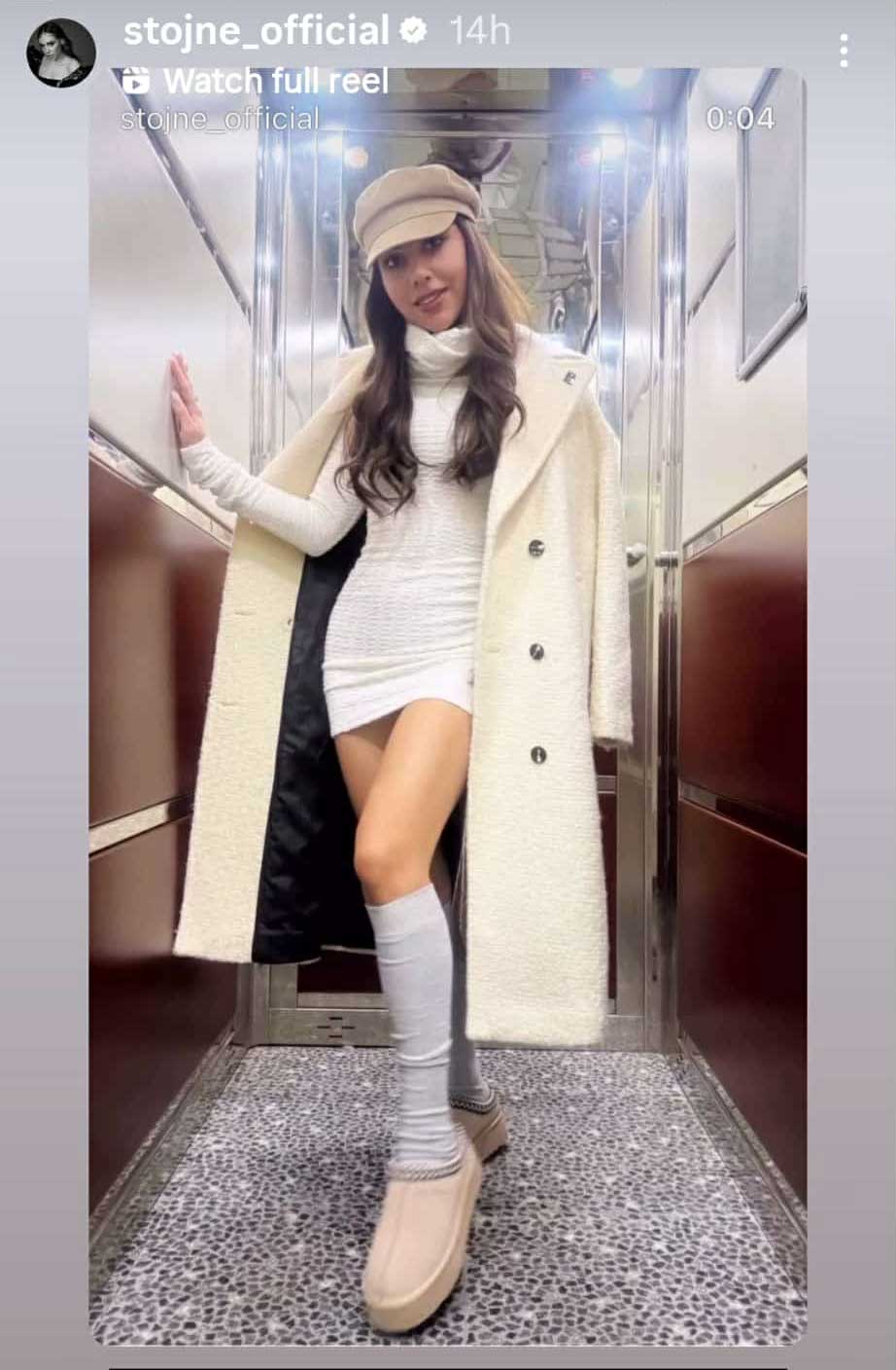 Имено, Стојне својот микро модел го носеше со тесно бело фустанче со ролка јака и долги ракави, преку кој носеше тренди капут во бела боја. Поприлично впечатлив беше моментот и со долгите зимски чорапи во светло сива нијанса, како и капчето во потемна беж боја.