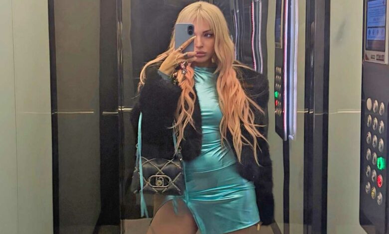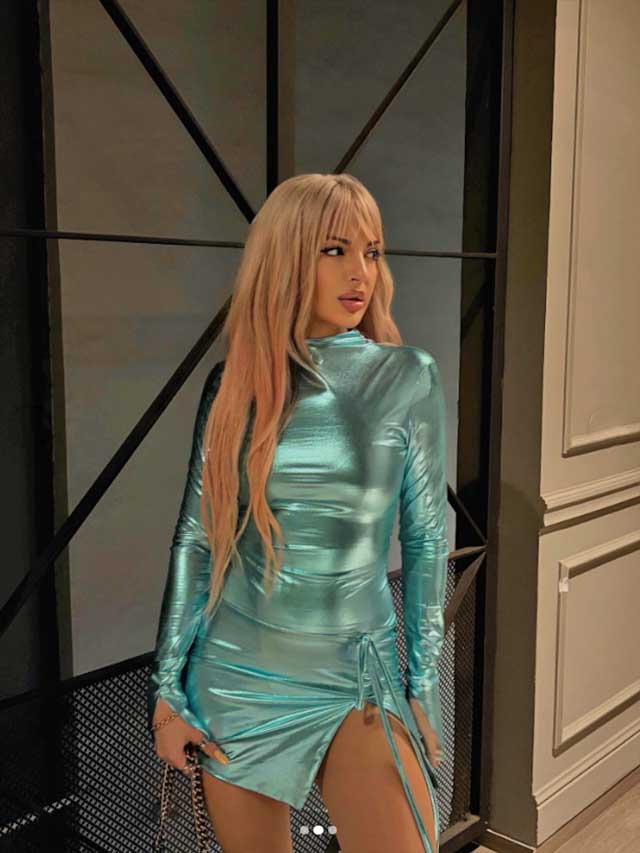 Носеше тесно фустанче во светкава тиркизна нијанса, но кој беше толку кус што за него навистина треба да се има храброст.