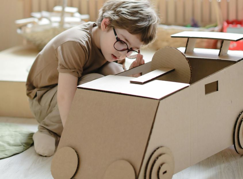 Кутијата може да биде автомобил, вселенски брод, замок, пештера, продавница, подморница… Детето само одлучува. Нема копчиња и звуци што му кажуваат што „треба“ да биде, мора само да размислува.