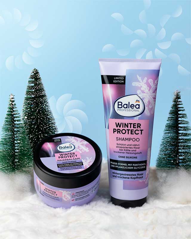 Студените денови можат да бидат вистински предизвик за вашата коса. Затоа, Balea ја создаде професионалната Winter Protect линија! Пробајте ги шампонот, балсамот и млекото за коса, кои интензивно ја негуваат, зајакнуваат и штитат косата од зимските оштетувања, оставајќи ја заштитена, сјајна и полна со живот.
