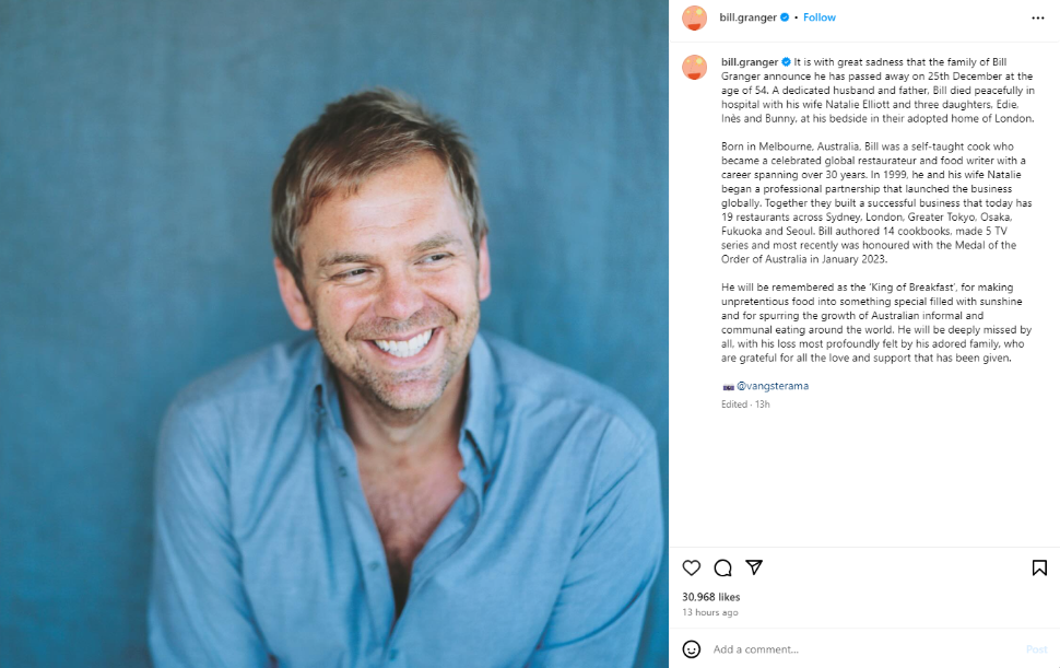 Австралискиот готвач Бил Гренџер почина во понеделникот (25 декември) на 54-годишна возраст.