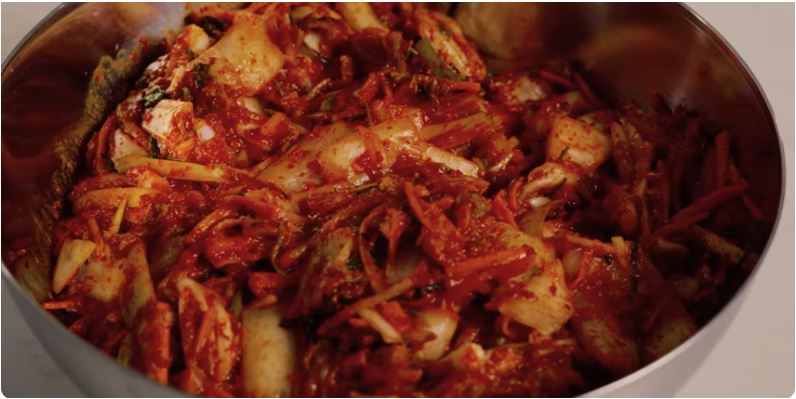 Неговиот специфичен вкус доаѓа од процесот на лактоферментација и мешавината од ароматични зачини како лук, ѓумбир и корејскиот чили во прав – гочугару, (секако вие може да употребите македонско чили во прав), што му дава препознатлива пикантност.
