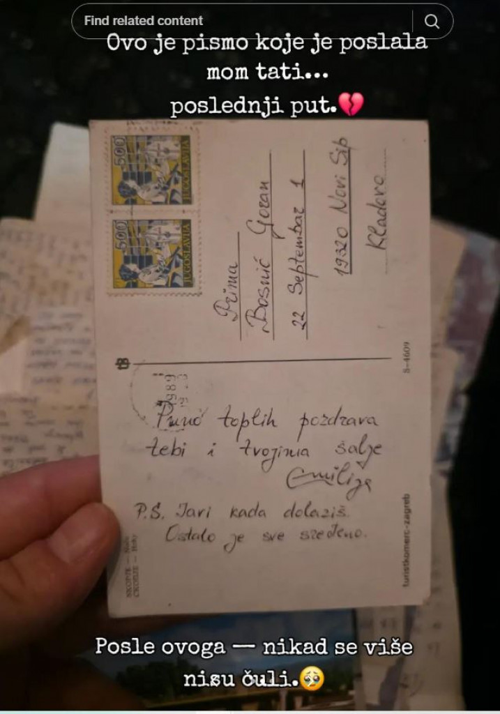 Втората фотографија е најемотивна, имено, пожолтена разгледница. Ракописот на Емилија е нежен, уреден, како од некое друго време. На крајот, во постскриптум, стои реченица што денес го стега срцето: