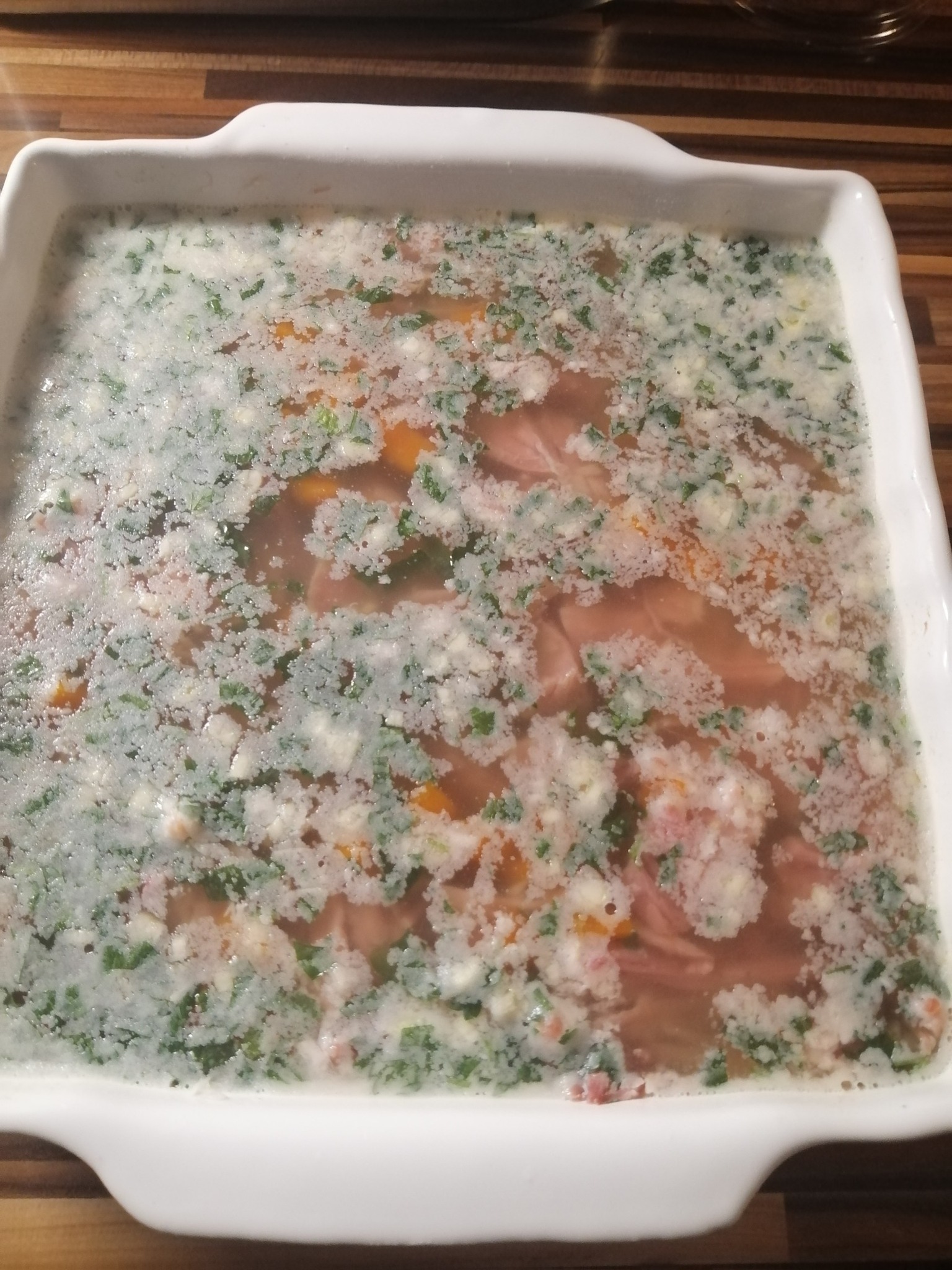Во смесата додава ситно сечкан магдонос и неколку (таа користи три) чешниња бело лукче. Сето тоа го полева со бистрата зовриена вода во која се вареле колениците.