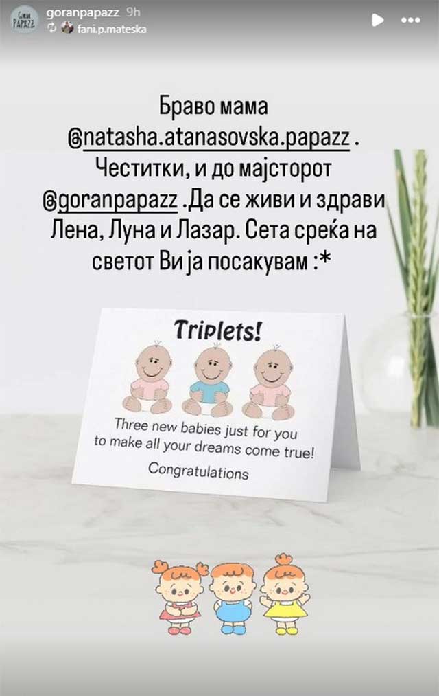 Потсетуваме, Горан и Наташа во јули оваа година прославија три години брак, а само неколку месеци претходно, односно во декември 2024 година, им се родија три близначиња Лазар, Лена и Луна.
