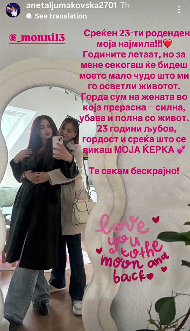 „Среќен 23 роденден моја најмила. Годините летаат, но за мене секогаш ќе бидеш моето мало лудо што ми го осветли животот. Горда сум на жената во која што порасна – силна, убава и полна со живот. 23 години љубов, грдост и среќа што се викаш моја ќерка, те сакам бескрајно“, напиша Анета на фотографијата што ја објави на социјалните мрежи, а на која е заедно со својата наследничка.