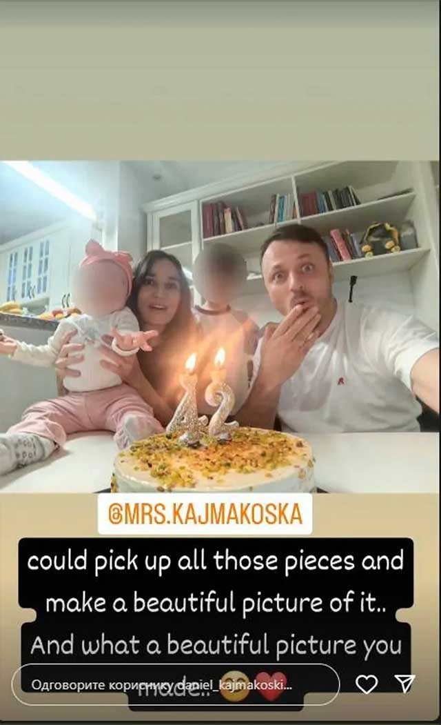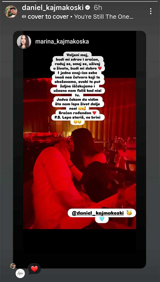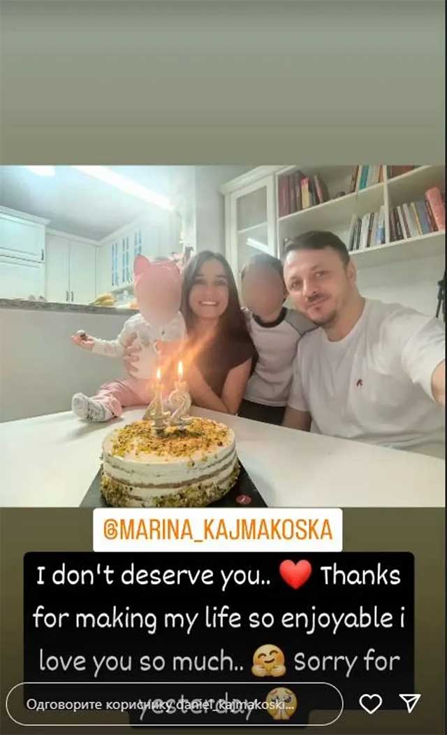 „Сакан мој, биди ми здрав и среќен, радувај се, смеј се, уживај во животот, биди ми добро. И едно знај – зад тебе не имаш нас четворицата кои те обожаваме, секој пат со љубов те очекуваме и ужасно ни фалиш кога не си тука. Одвај чекам да видам што ни носи животот понатаму, Среќен роденден, старееш убаво, не грижи се“, му напиша Марина, сопругата на пејачот со која тој е во брак од јануари 2023 година.