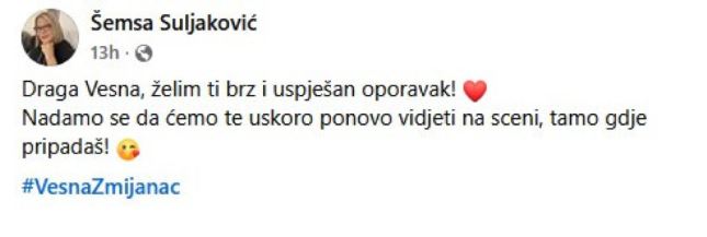„Драга Весна, ти посакувам брзо и успешно закрепнување. Се надеваме дека наскоро повторно ќе те видиме на сцената, таму каде што ти е местото“, напиша Шемса, со емотикони срца и бакнежи.