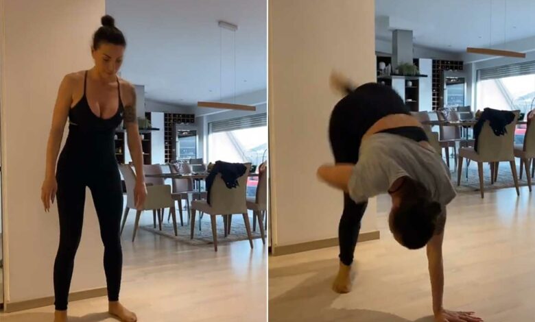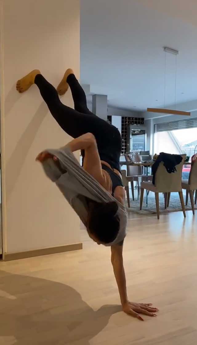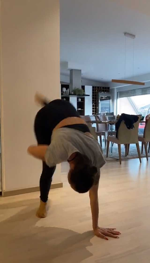 Ова секако не го препорачуваме на сите да го пробаат дома, но повеќе од очигледно е дека нашата пејачка и покрај бројните обврски, сепак успева да најде време за вежбање, па дури и во својот дом.