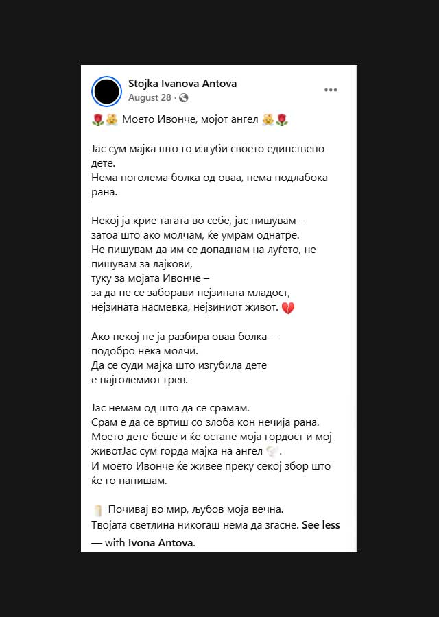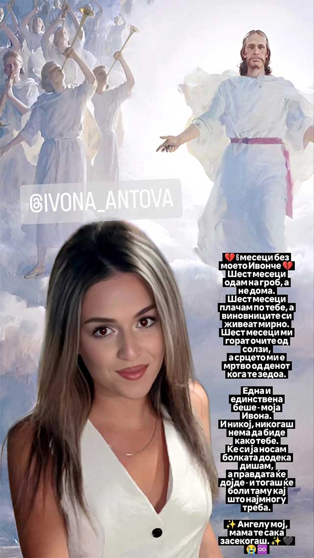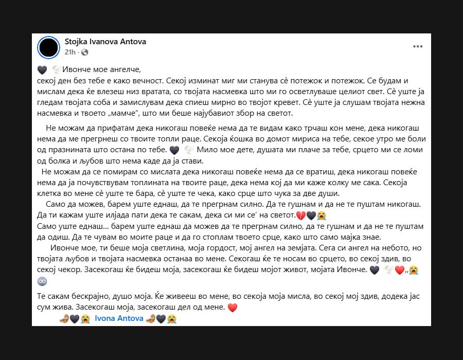 „Ивонче мое ангелче, секој ден без тебе е како вечност. Секој изминат миг ми станува сè потежок и потежок. Се будам и мислам дека ќе влезеш низ вратата, со твојата насмевка што ми го осветлуваше целиот свет. Сè уште ја гледам твојата соба и замислувам дека спиеш мирно во твојот кревет. Сè уште ја слушам твојата нежна насмевка и твоето „мамче“, што ми беше најубавиот збор на светот. Не можам да прифатам дека никогаш повеќе нема да те видам како трчаш кон мене, дека никогаш нема да ме прегрнеш со твоите топли раце. Секоја ќошка во домот мириса на тебе, секое утро ме боли од празнината што остана по тебе. Мило мое дете, душата ми плаче за тебе, срцето ми се ломи од болка и љубов што нема каде да ја стави“, напиша на почетокот од своето обраќање мајката на Ивона, Стојка Иванова-Антова, во објавата што ја сподели со нивна заедничка фотографија.