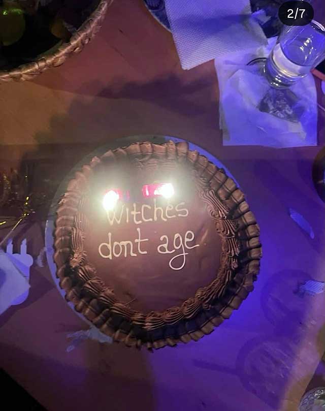 Покрај сопругот и сестрата, водителката својот 45 роденден го прослави заедно со своите најблиски и пријатели, а посебно внимание привлече и тортата на која на англиски пишуваше: „Вештерките не стареат“.