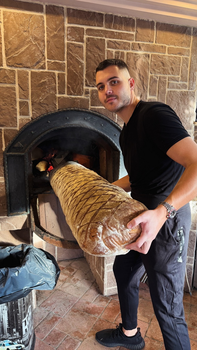 На видеата и фотографиите што ги сподели може да се види огромен домашен леб печен во фурна во дворот, казан во кој тивко врие месо – најверојатно за чварки – како и свежи колбаси што се подготвуваат за вечерашната богата трпеза.