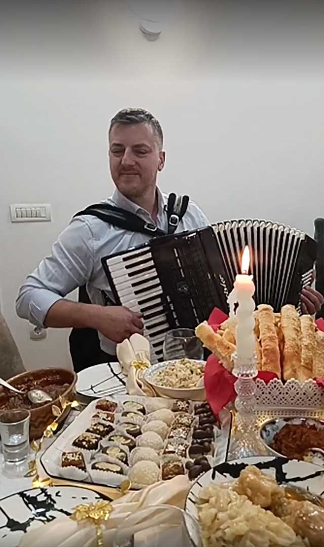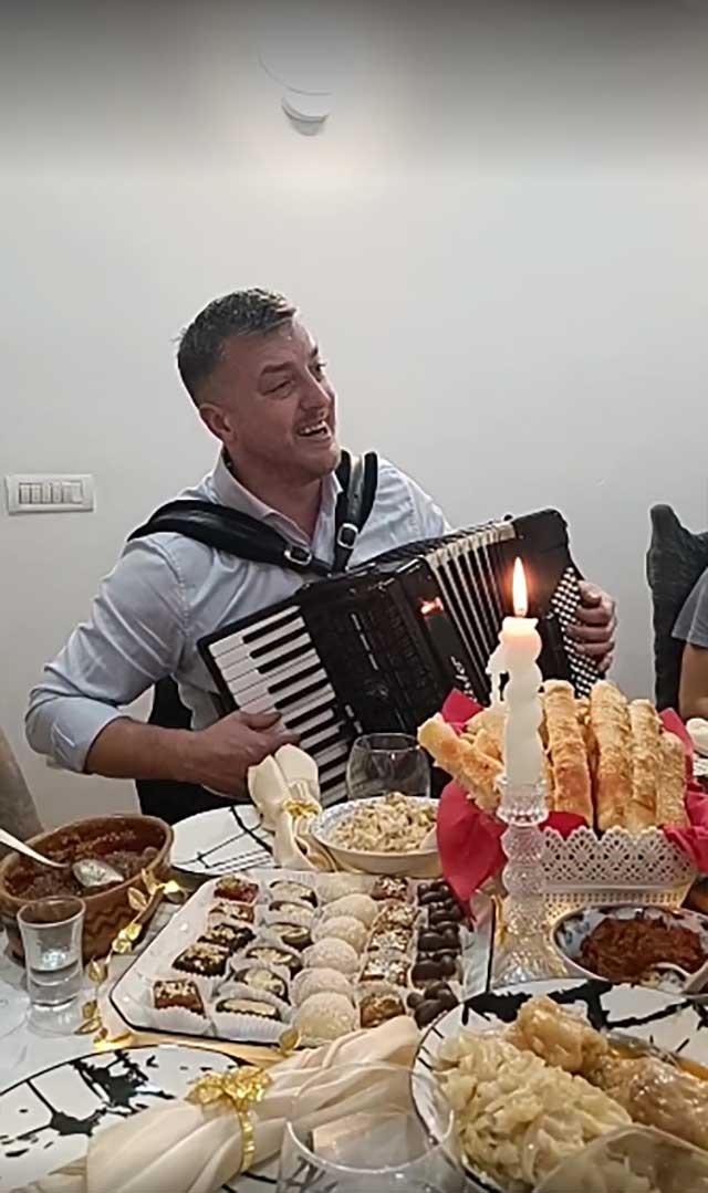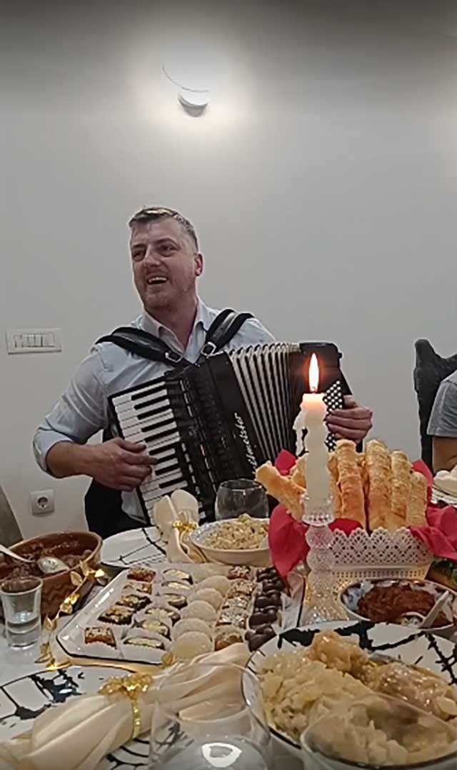 Тие седат на маса на која има најразлични јадења, во поприлично весело расположение, а атмосферата го доживеа својот врв кога Спасен ја зеде хармониката и запеа заедно со татко му.