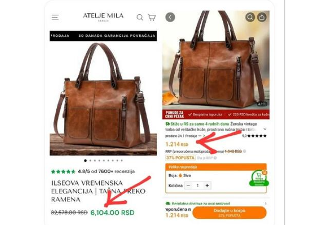 Поточно, станува збор за чанта од брендот „Ателје Мила“, која, според продавачот, наводно била намалена од 32.500 дeнари на 6.104 дeнари, што е претставено како попуст од дури 80%.
