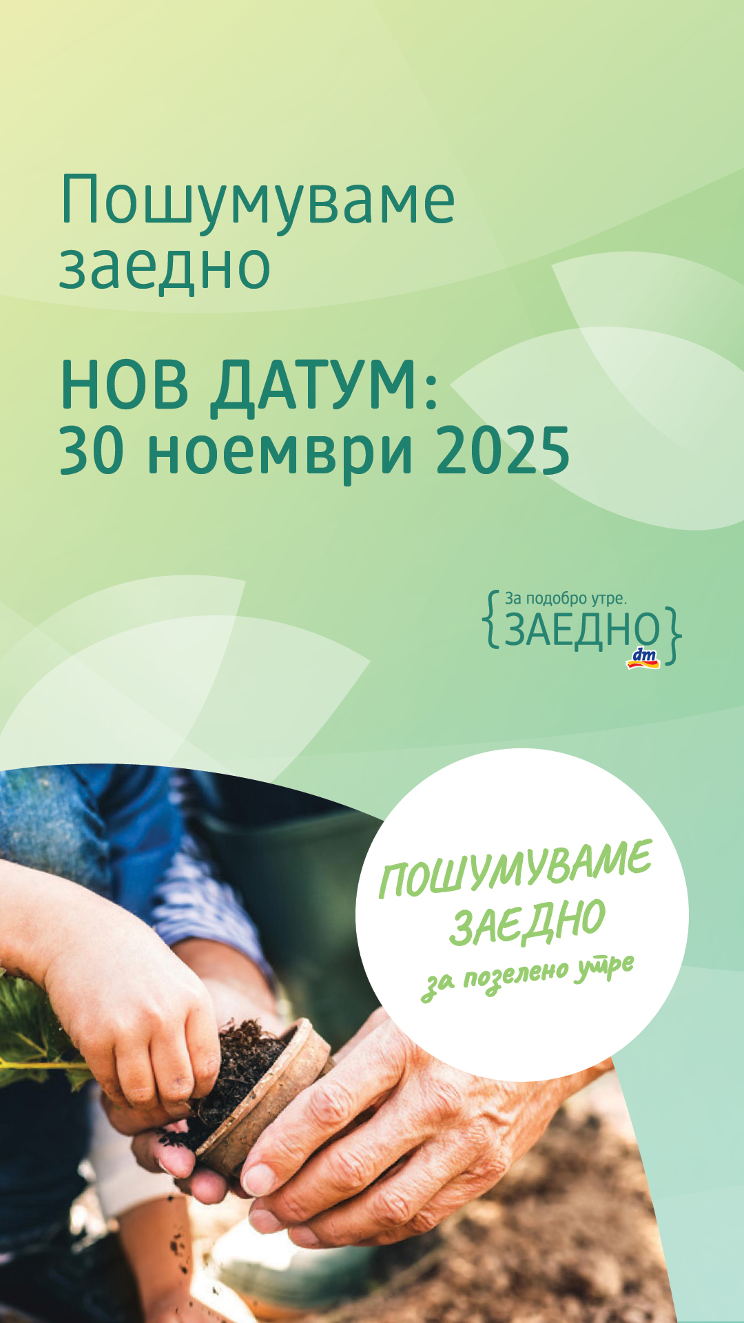 Компанијата dm drogerie markt ги известува сите пријавени лица дека одржувањето на четвртото продолжение на еко-проектот „Пошумуваме заедно за позелено утре“ – најмасовната акција за пошумување досега, наместо на 23 ноември се одложува за 30 ноември 2025.