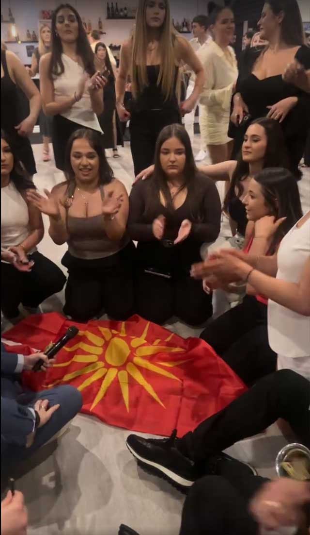 На снимката се гледа како братучедите заедно со музичарите седат на подот, опкружени со убави млади Македонки од Австралија.