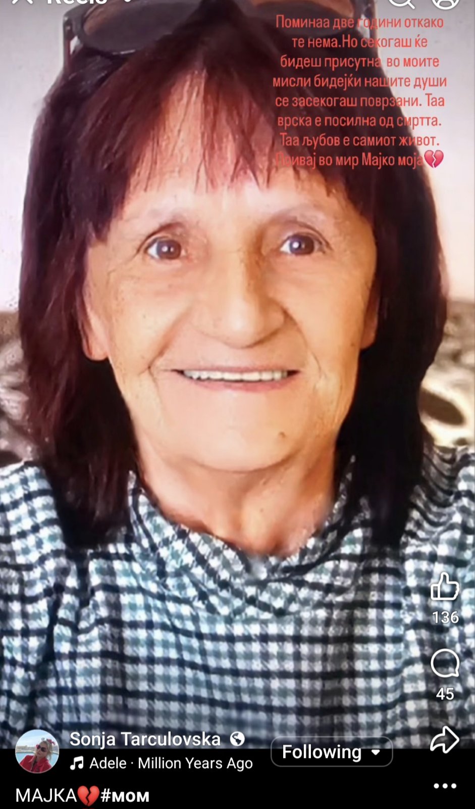 Емотивна годишнина во домот на Соња Тарчуловска. Фолк-пејачката преку објава на Фејсбук се присети на својата мајка, која почина пред две години, споделувајќи тажен, но силен спомен за врската која, како што вели, не згаснува со смртта.